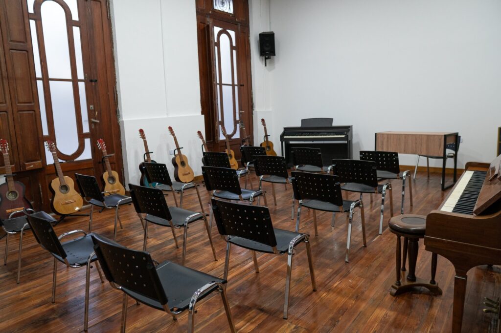 Se invirtieron más de 50 millones de pesos en una obra que cuenta con infraestructura y equipamiento necesario para desarrollar la enseñanza y aprendizaje de diferentes instrumentos musicales. Son 460 metros cuadrados de refacción, tanto en el interior como en el exterior. La escuela ahora está ubicada en la Sociedad Española (San Martín 960), dónde se puso en valor toda la estructura dónde hace años funcionó la municipalidad.