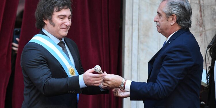 Luego, Fernández le colocó la banda presidencial y le entregó el bastón de mando, y luego saludó a Milei, quien en forma inmediata saludó al exmandatario Mauricio Macri, que permaneció sentado junto a otros expresidentes y futuros ministros, en los palcos ubicados al lado estrado presidencial del recinto de la Cámara baja.