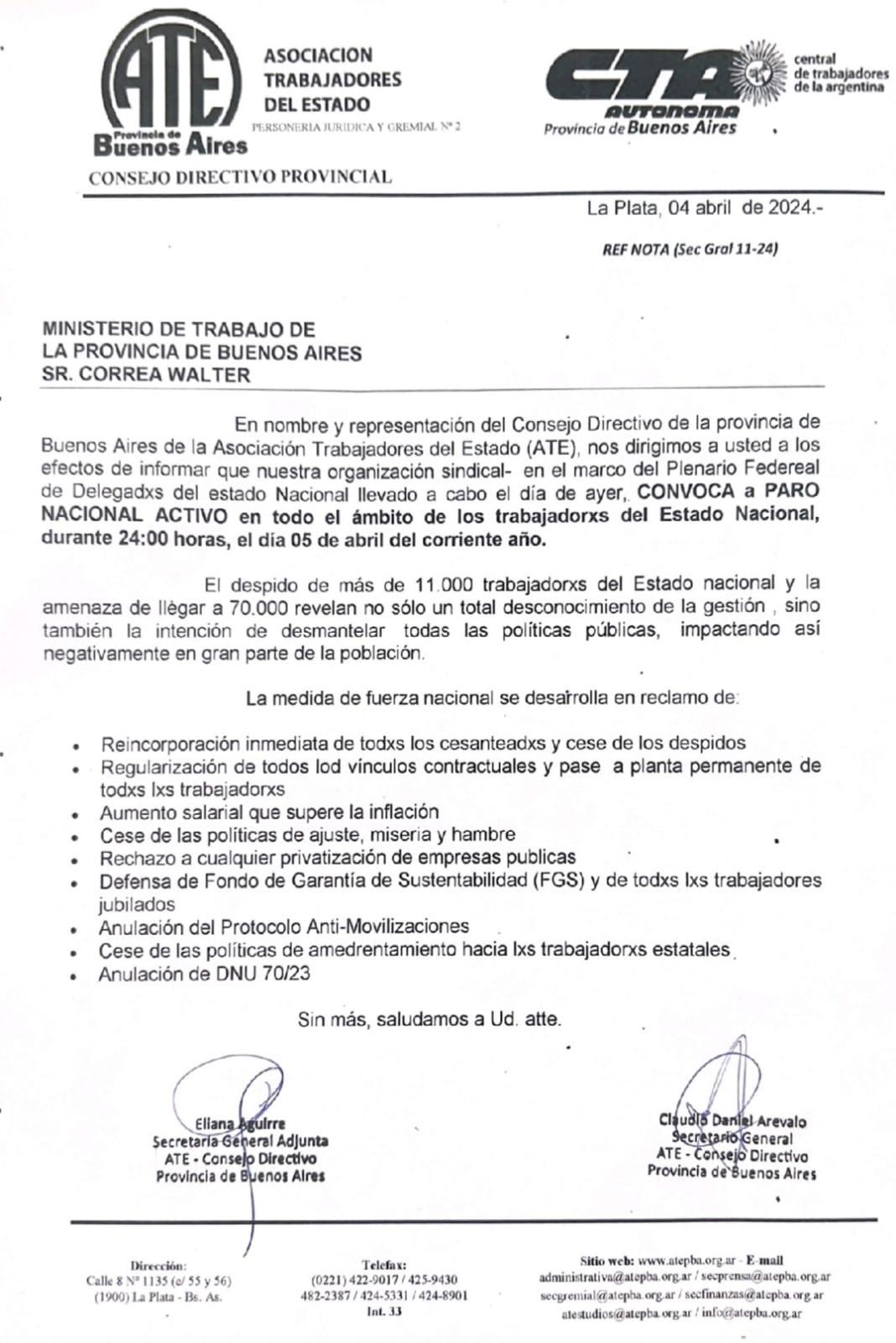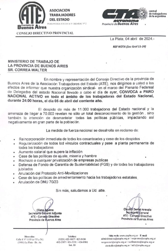 El paro es por 24 horas y reclama por el despido de más de 11 mil trabajadores y la posible amenaza de llegar a más de 70 mil. Así lo indicó la nota que ingresó al Ministerio de Trabajo de la provincia ya que este paro alcanza a todos los niveles de la administración pública.